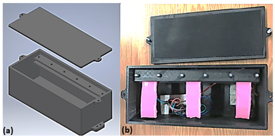 The next step was to design and implement a protective case for the energy-harvesting subsystem. The container was also designed in CAD software (3D Autodesk Inventor CAD) and 3D-printed with PLA technology. When the CAD was generated, it was ensured that the rubber plates were in contact with the case to allow the piezoelectric sensor and rubber plate to take advantage of the vibrations and thereby increase the quantity of harvested energy. The case was designed with holes on the outside of the box to tie the case to the chassis using belts. The CAD and manufactured solutions are shown in Figure 14.