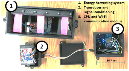 This subsection explains all the work carried out to design and manufacture the smart sensor. The prototype comprised a transducer, a CPU, a wireless module, and a harvesting system.