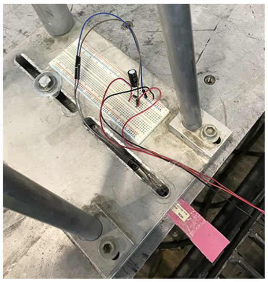 Figure 12 shows that the voltage that was produced by the piezoelectric sensors and temporarily stored in the capacitor passed through the circuit and fed the sensor’s batteries. The diode was used to rectify half of the voltage that was going through the circuit. After the sinusoidal signal was halved when it went through the capacitor, it rectified the signal into an average of the signal voltage. This allowed the system to be charged by the voltage exiting the capacitor. To increase the amount of harvested energy, we added two more piezoelectric sensors in parallel [44]. The improved solution is shown in Figure 13.