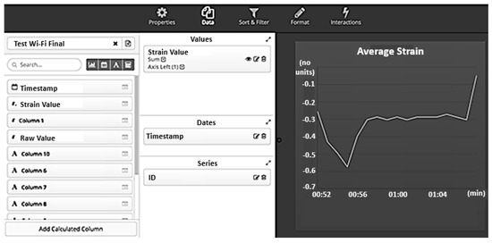 The indicator-panel programming included graphs and numerical variables for the application and a chart. A line chart was selected to present the measured strain as a function of time. Moreover, the dashboard also included columns Strain Value for the section Value, Timestamp for the section Dates, and ID for the section Series. The Click Data website provided all these options within the graph settings, including an update of the displayed data every minute.