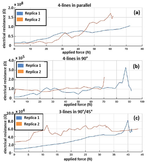 On the basis of the MRE transducer results, from the tensile tests in Figure 21, for the four-line parallel lines pattern, the replicas showed similar behavior. At the beginning of the test, a linear tendency was observed, but the slopes of the graphs were different. The rate of resistance change was higher in Replica 2 than that in Replica 1. For the 90-degree array, similarity between the two replicas was observed. The behavior could not be linearly described because, in Replica 2, electrical resistance did not vary as much as that in Replica 1 did. For the 45-degree array, Replica 1 had an almost perfectly linear tendency throughout the whole test. However, Replica 2 showed an increase in resistance as the force went up, but some noise was present from 5 to 35 N.