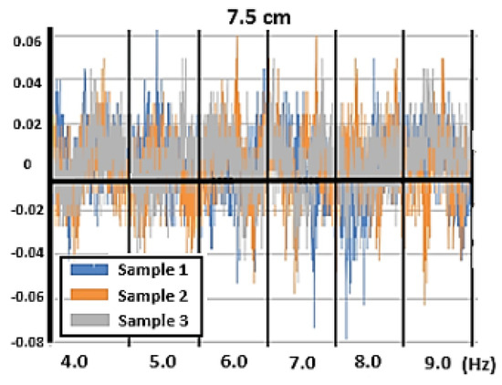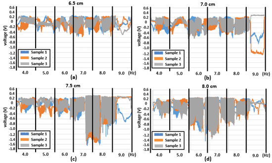 Measured output voltage (Vout) for a 7.5 cm length cantilever beam with three piezoelectric sensors, as shown in Figure 13. Three samples were applied for each test (length and frequency). Small black numbers, accumulated voltage measurements.