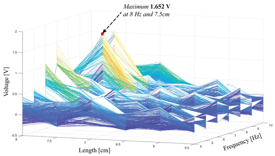 For each of the 3 experiments carried out, the cantilever length was set and a signal was applied so that the metallic beam started to vibrate. Considering the length and frequency ranges specified in Section 4.2, for each replica, the results of the series of experiments are depicted in Figure 24, Figure 25 and Figure 26. Of the three experiments, the maximum generated voltage occurred when the cantilever beam length was 7.5 cm and the excitation signal had a frequency equal to 8.0 Hz.