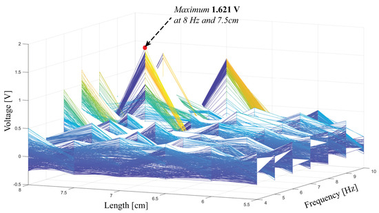 The energy harvesting outcomes, which are depicted in Figure 24, Figure 25 and Figure 26, were concentrated in the 2D graphs shown in Figure 27. The graph of the generated voltage, which is function of the beam length and the input signal frequency, shows the maximum generated voltage with an input signal around 8.0 Hz and with a length equal to 7.5 cm. For all the tests run, these two combinations of independent variables contributed to harvest the highest amount of energy with values between 1.20 and 1.625 V.