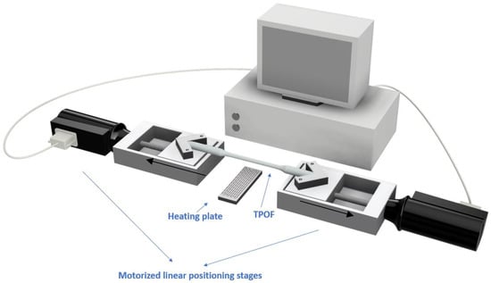 We have developed a novel automatic system to realize TPOFs. Figure 1 shows a schematic view of the realized system. In particular, it includes two motorized linear positioning stages (M150.11, Physik Instrumente (PI), Karlsruhe, Germany) connected to a computer and a heating plate (up to 100 °C). The POF is kept at a fixed height of about 1.5 cm from the heating plate (see Figure 1). The plastic optical fiber used presents a Poly(methyl methacrylate) (PMMA) core of 980 μm and a fluorinated cladding of 10 μm.