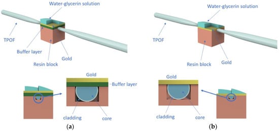 As the first step to realize these SPR sensors, we fixed the obtained TPOFs in a resin block to remove the TPOFs’ cladding and part of the core using two different polishing papers (5 and 1 μm), giving us the desired D-shaped region in a way similar to []. The TPOFs were realized as described in Section 2.