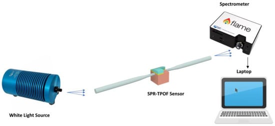 To test the SPR-TPOF sensors, we used the experimental setup shown in Figure 4. It is composed of a white light source illuminating the SPR-TPOF sensor and a spectrometer connected at the end of the sensor. The halogen lamp (HL-2000-LL, manufactured by Ocean Optics, Dunedin, FL, USA) exhibited a wavelength emission range from 360 to 1700 nm, while the spectrometer (FLAME-S-VIS-NIR-ES, manufactured by Ocean Optics, Dunedin, FL, USA) had a detection range of 350 to 1000 nm.