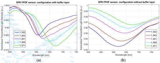 At an early stage, we tested two SPR-TPOF sensor configurations, one with and one without the photoresist buffer layer, to determine if the use of this intermediate layer leads to a sensitivity enhancement similar to the SPR platform based on non-tapered POFs []. Both SPR-TPOF sensors had the same taper ratio of about 1.8 and had been tested with different water–glycerin mixtures in contact with the gold film (the refractive index ranged from 1.332 to 1.371).