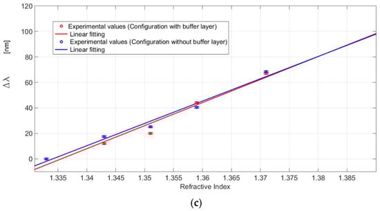 The variation in resonance wavelength with respect to the water (1.332) as a function of the refractive index, along with the quadratic fitting to the experimental data, is reported in Figure 7d for all three configurations. In Figure 7d, each experimental value is the average of five subsequent measurements, and the respective standard deviations (error bars) are shown too. In Figure 7d, instead of the linear fitting, the quadratic fitting of data has been shown in order to improve the accuracy. In particular, for the three tested configurations, the fitting curve and the parameters are reported in Equation (2) and in Table 1, respectively.