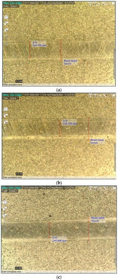 In Figure 6, three pictures of different configurations of SPR-TPOF sensors are presented. After having obtained different TPOFs in terms of taper ratio using the developed system described in Section 2 to make the SPR sensors, we used the same procedure already described in Section 3 (configurations without the buffer layer) to obtain these three SPR-TPOF sensors by fixing different TPOFs in resin blocks, polishing them, and sputtering the same gold film on their D-shaped area (1 cm long). The images in Figure 6 were acquired by Dino-Lite digital microscope (AnMo Electronics Corporation, Taiwan). Configurations “A”, “B”, and “C” present taper ratios of about 1.3, 1.4, and 1.5, respectively.