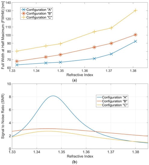 Figure 9 reports both (1) FWHM and (2) SNR defined in Equation (3) as functions of the refractive index for all three configurations. As can be seen, configuration “C”, which has shown to have the better sensitivity, presents the highest values of FHWM and the worst SNR. This duality between sensitivity and SNR is a well-known result, and it depends on the influence of the higher-order modes over both parameters [].