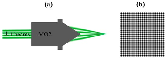 Schematic of the generation of the multifocal arrays. (a) The four remaining laser beams are focused by the MO2. (b) The multifocal array generated by the interference and overlap of the four laser beams.