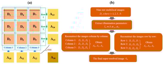 Framework of the reconstruction procedure for the multifocal structured illumination microscopy (MSIM) data. (a) The procedure of the reconstruction for the MSIM data, where D1–D9 are nine raw multifocal images arranged in three rows and three columns. A10–A12 are obtained images reconstructed with Column 1–Column 3, while A13–A15 are obtained images reconstructed with Row 1–Row 3, respectively. A16 is the final super-resolved image obtain by the sum of A10–A16. (b) Schematic of the reconstruction procedure for the MSIM data.
