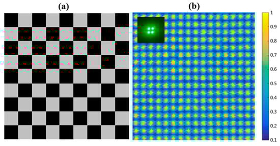 Before subsequent experiments, it is necessary to check the quality of the multifocal arrays illuminating on the sample plane. Figure 4a is the part phase profile of the checkerboard phase plates loaded on the SLM, and Figure 4b shows the intensity distribution of the multifocal arrays generated by the four laser beams in our experiment. To characterize the amplitude fluctuation of each foci in the multifocal array, we extracted the amplitudes of each single foci and found that the peak intensity of each foci fluctuates within a small range, which would have little effect on the extraction of the illumination parameters. The multifocal array with equivalent periods along the X and Y directions is almost evenly distributed, which is vital to reconstruct an isotropic super-resolved image.