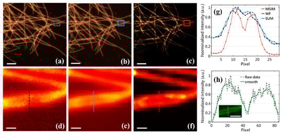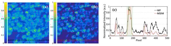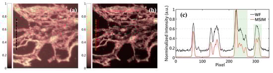 where and are the maxima and minima of certain regions in the images, respectively. Compared with WF, the contrasts of MSIM in Figure 8c and Figure 9c are enhanced by a factor of 1.1319 and 1.2083, respectively. Based on SIM, only the high-frequency components of the sample modulated by MSIM are demodulated out to enhance the resolution of the final images, while the random noise of the background cannot be modulated by the patterned illumination. Once the high-frequency components representing the details of the sample are enhanced, the overall amplitude of the fluorescent signal-to-noise ratio (SNR) will be improved. Therefore, our structured illumination modality and reconstruction approach could achieve great performance with high image contrast.