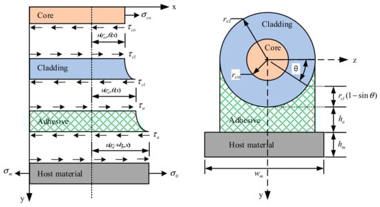 In this model, subscripts co, cl, a, and m represent core, cladding, adhesive, and host material, respectively. τ , σ , ε , and γ are shear stress, normal stress, shear strain, and normal strain, respectively; G and E represent shear modulus and Young’s modulus; and r , L , h , θ , and w are radius, half-bond length of the adhesive, height, angle, and width, respectively.