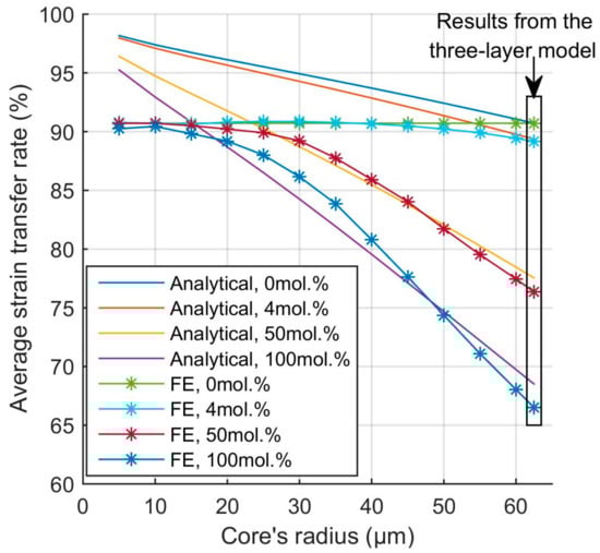 The influence of the fiber core’s radius and alumina content on the ASTR was studied. Figure 6 shows the simulated results calculated from both the analytical four-layer model and the FE model. When the core’s radius increased to the cladding’s radius (62.5 μm), the ASTRs of the four-layer model for different alumina contents were approximately equal to the corresponding rates from the three-layer model (see black rectangle in Figure 6). Simulated results indicated that ASTRs generally experienced a decreasing trend as the core’s radius increased from 5 to 62.5 μm. For example, when the alumina content was 50 mol %, ASTRs from the four-layer and FE models decreased from 97.2% to 77.6% and 92.1% to 76.4%, respectively. This could mainly be attributed to two factors. First, cladding thickness decreased with the core’s increasing radius, which was beneficial to the efficient transfer of strain from the adhesive to the core. Second, increasing radius reduced the normal stress on the cross section of the core because normal stress is approximately inversely proportional to the core’s radius, as shown in Equation (11). Although both factors mitigated each other, the latter was proven to be stronger, which led the ASTR to decrease with the core’s increasing radius. In addition, increasing alumina content also led to a decrease in ASTRs. When the core’s radius was fixed at a certain value, such as 30 μm, ASTRs from the four-layer and FE models decreased from 95.3% to 84.1% and 91.5% to 85.9%, respectively. Significant strain loss resulted from large shear deformation that occurred in cladding.