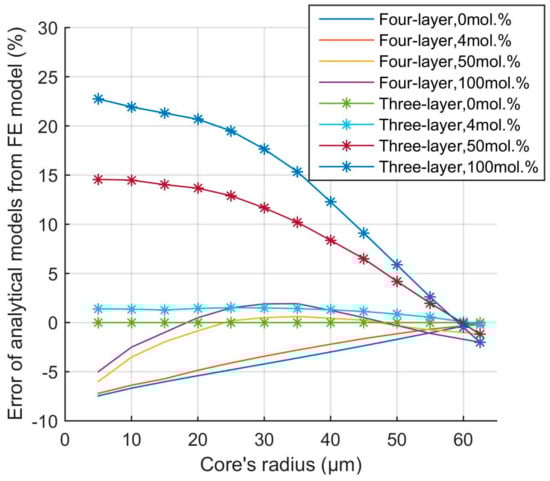 Errors of the four- and three-layer models from the FE model are shown in Figure 7. For the cases where there was no- and low-alumina content (m = 0 mol % and m = 4 mol %), the three-layer model achieved smaller error percentages than those of the four-layer model. This was reasonable because the three-layer model assumed homogeneous material within the fiber region, which was consistent with the fact that the fiber was still mainly composed of silica. Therefore, the three-layer model was more suitable than the four-layer model for predicting transfer efficiency when there was no or low alumina dopant in the core. For cases of high alumina content (m = 50 mol % and m = 100 mol %), however, error percentages of the four-layer model from the FE model were significantly smaller than those of the three-layer model. The change in errors indicated that the core and cladding needed to be treated as separate layers instead of a unit because the Young’s modulus of the alumina/silica core was much higher than that of the silica cladding. As a result, the four-layer model was a better choice than the three-layer model to predict ASTR for the fiber with high alumina content.