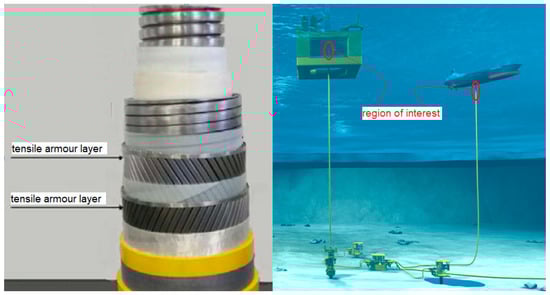 The prismatic bar could be considered simplified components of a flexible pipe (riser) used commonly in the offshore oil industry, more specifically when forming the structural amour layer of this system (see Figure 1a). The original motivation of the present work consists on developing an non-destructive technique (NDT) using a wave propagation framework that allows detecting damage in a critical region of the riser close to the platform connection (see Figure 1b). Details about the application of the NDT based on guided waves in this kind of structure can be seen [,].
