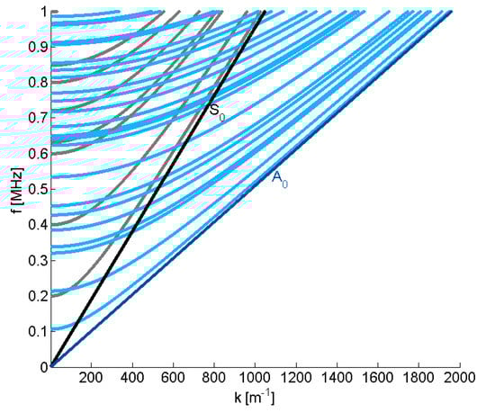 Lamb [], in 1917, developed a solution for wave propagation in plates whose response relates to angular frequency (ω) with the wavelength (λ). This solution is known as the transcendental equations of Rayleigh–Lamb [,]. In addition to the analytical solution, the graphical representation of these equations is known as the plate dispersion curves. In the dispersion curves, each curve represents a propagation mode [], which can be written in terms either of frequency (ω = 2π/T, f = 1/T) vs. the wavenumber (k = 2π/λ k = 1/λ), or phase velocity (c) vs. frequency, remembering that c = ω/k. Moreover, it is possible to represent the dispersion curves in terms of group velocity vs. frequency since the group velocity is defined as: []. This way to present the solution of the waveguide propagation (curves that represent the propagation modes and their frequency and wavenumber relations) is usual in acoustics, acting as a map of the waveguide propagation. There are a lot of publications on the computational methods on which research was based on to build the dispersion curves; among others, we cited the work presented in [] where the key works in this topic are commented.