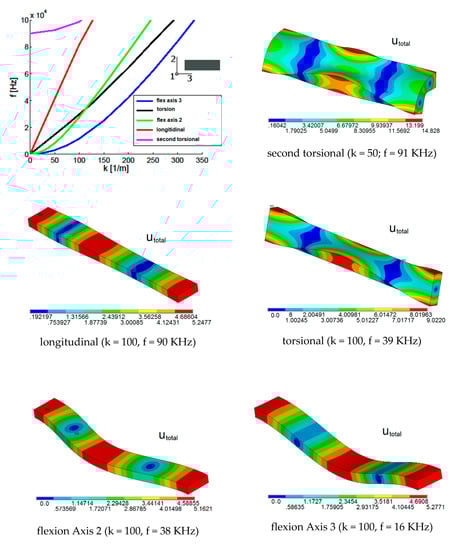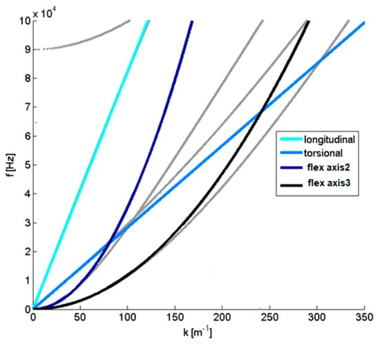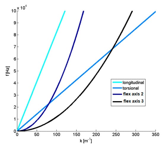 If the rectangular rod is considered as a beam, it is possible to generate the dispersion curves from the balance of forces applied over an infinitesimal portion of the waveguide, and considering the hypotheses that allow the solution of the differential equation of equilibrium in terms of ω and k [,]. In Figure 3, four modes from three known movements of beams: axial tension, torsion, and bending in two main directions are shown. In Table 1, the expression that defines these curves are presented and described.