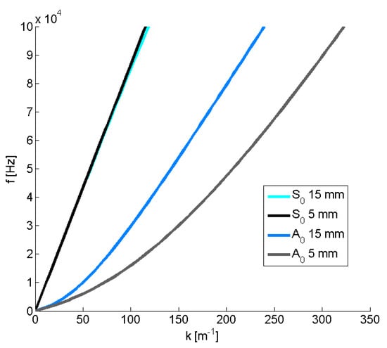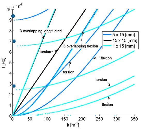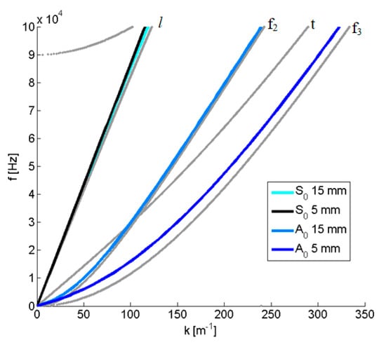Dispersion curves of the rectangular stem computed from the two plates overlapping as presented [], one considering a thickness of 15 [mm] and the other one a thickness of 5 [mm]. The axis orientation is presented in Figure 5g. Notice that in this graph the wave number is defined as k = 2π/λ [m−1].