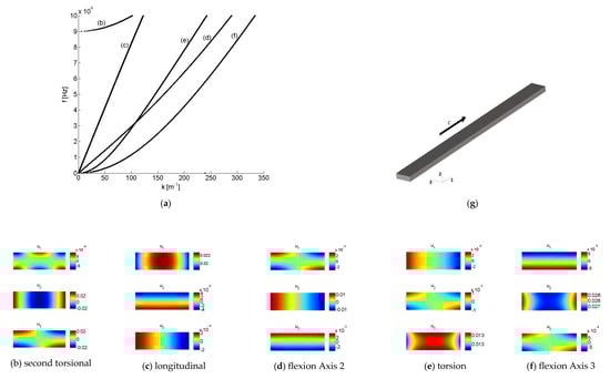 (a) Dispersion curves computed using the Pedroi et al. method presented in []. Displacement field of (b) second torsional, (c) longitudinal, (d) torsional, (e) flexural (around Axis (2)), (f) flexural wave mode (around Axis (3)). (g) The waveguide scheme with the reference axes indicated. Notice that in this graph the wave number is defined as k = 2π/λ [m−1].