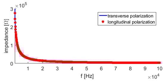 - Two piezoelectric ceramics (PZT) Ferroperm®, with dimensions 1 × 3 × 13 [mm] and longitudinal and perpendicular polarizations which were used as an excitation transducer. Its frequency vs. Impedance response is presented in Figure 8, where it is possible to perceive that in the interval of frequency used [0, 100 KHz], these transductors present a response without resonances for the longitudinal and transversal polarization.