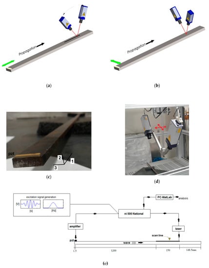 The PZT ceramic was glued at the end of the specimen with an epoxy resin, as shown in Figure 8c. The setup is excited with a potential difference V(t) with a tone-burst function, built within Hanning window [], with different frequencies in the range between 0, 100 [kHz], (5 cycles, with 100 [V] of decrement peak to peak). The ceramic vibration excites the surface of the specimen, and this perturbation propagates along the bar as a guided wave. The surface displacement is captured by the vibrometers. In Figure 9a,b the position of the vibrometers are shown. Notice that the vibrometer’s arrangement is sensitive to the displacements directions. Figure 9e shows the scheme of how the components are arranged as well as the path of the electrical signals.