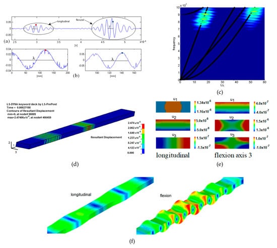 Notice that the highest energy of the captured signal is concentrated on the excitation frequency in correspondence with the regions where the dispersion curves pass. Finally, Figure 10d–f and Figure 11d–f show the displacement fields obtained by the finite element simulation where the time is integrated using an explicit scheme of integration performed using Ls-Dyna [] applying the same excitations. Studies using this methodology applied to the investigation of wave propagation can be found in [,]. This simulation illustrates the test that was performed where the geometry was discretized with cubic elements of a size of 0.5 [mm].