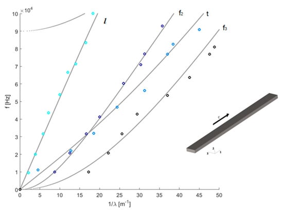 Comparison made between experimental results (dots) and theoretical dispersion curves obtained using SAFE [] implemented in the COMSOL [] environment (lines). Moreover, l = longitudinal mode, f2 = flexion around 2, t = torsion, f3 = flexion around Axis 3. Notice that, in this plot the wave number is defined as k = (1/λ)