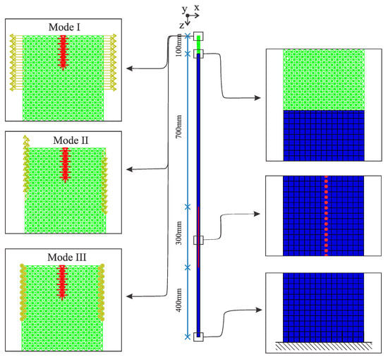 Description of the Model Implemented: The same prismatic waveguide used in the article was simulated using an LDEM + FEM model implemented in the ABAQUS system environment. Details of this implementation could be found in []. In this model, a specific toughness must be defined with the value of Gf = 90 KN/m; this value was adopted using as reference []. The value of p = 1 × 10−3, the third parameter that must be defined in the LDEM constitutive model was defined taking into account that in the global results for tensile strain test, the model begins to lose its linear behavior. A pre-fissure was induced by weakening the bars indicated in red in Figure 19. In the same figure, the arrows indicate the forces applied in the three cases analyzed to induce the fissure propagation in each characteristic fracture mode, that is, Mode I, II, and III depicted in Figure 20a. Moreover, in Figure 19, the positions of 300 nodes are indicated with a red line showing where the higher displacements are measured. Then, the same procedure presented in Section 3 is applied so as to present the results of the AE event in the frequency vs. wavenumber domain.
