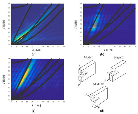 Results: In Figure 20b–d, the displacement in the z-direction for the solicited pre-fissure in Modes I and II and the displacement in the y-direction for the Mode III are presented in the frequency vs. wave-number domain.