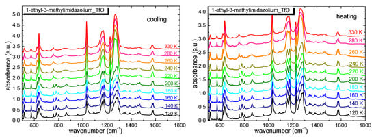 Figure 2 reports the infrared absorption spectrum of EMI–TfO measured on cooling from 330 K down to 120 K and subsequent heating from 120 K up to 330 K, in the frequency range between 500 and 1800 cm−1. In all spectra, the most intense lines centered around 518, 574, 638, 1031, 1167, 1226, 1266 cm−1 are known to be due to the vibrations of theTfO anions [49]. The less intense lines between 680 and 1000 cm−1, as well as the absorption bands above 1300 cm−1, are due to the vibration modes of the EMI cation [32].