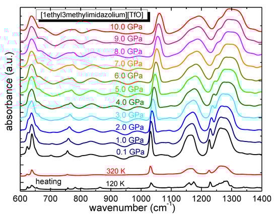 Figure 3 displays the evolution of the infrared absorption between 600 and 1500 cm−1 as a function of pressure in the range 0.1–10 GPa. Note that a background of interference fringes, due to multiple reflections between the two parallel diamond surfaces, is present over the whole spectral and pressure range. At low pressures, one can clearly observe the intense absorption lines of the anion centered around 639, 1031, 1163, 1225 and 1263 cm−1, similar to the same bands measured at 330 K in the temperature-dependent experiments, which are reported for comparison in the lower part of Figure 3. Concerning the cation vibrations, one can observe the line around 758 cm−1 and the CH bending bands above 1300 cm−1. With the increasing of the applied pressure, p, all bands shift towards higher frequencies, as expected, except for the absorption band centered around 639 cm−1, that corresponds to the SO bond vibration [35]. This fact can be ascribed to a high strength of the SO double bond; such resilience to frequency shift of the SO vibration around 630 cm−1 was observed also in N-trimethyl-N-propylammoniumbis(trifluoromethanesulfonyl)imide and N-trimethyl-N-hexylammoniumbis(trifluoromethanesulfonyl)imide, whose TFSI anion has two SO2 groups with the same type of vibrations around 620 cm−1 [23].