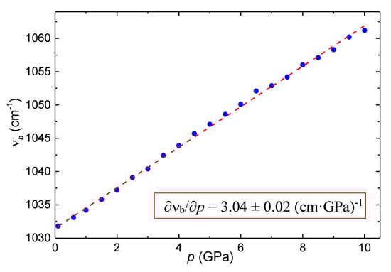 With increasing p, no splitting nor any abrupt disappearance of absorption lines is visible, suggesting that the sample does not undergo a crystallization process. In the literature, the occurrence of phase transitions as a function of pressure has been revealed in some cases by a change of the slope of the position of absorption peaks as a function of applied pressure. Most of the intense absorptions reported in Figure 3 do not appear as single bands, as they are composed by multiple contributions. Only the absorption line centered around 1031 cm−1 for p = 0.1 GPa can be assimilated to a single band. A fit with a single Lorentzian curve for this contribution has been performed for all the measured pressure spectra and Figure 4 reports the frequency of such a vibration band, νb, as a function of p. It is well evident that the slope remains constant on the whole pressure range here investigated. Therefore, it seems unlikely that the sample undergoes any crystallization as a function of pressure. This behavior is quite different from the temperature dependence, which, on the contrary, indicates the transformation towards a crystalline state at low temperatures. By a fit of the data reported in Figure 4, one obtains a variation of the vibration frequency versus applied pressure of ∂νb/∂p = 3.04 ± 0.02 cm−1·GPa−1. This value is close to those reported for 1-decyl-3-methylimidazolium tetrafluoroborate, 1-octyl-3-methylimidazoliumtetrafluoroborate, 1-butyl-2,3-dimethylimidazolium tetrafluoroborate, 1-butyl-1-methylpyrrolidinium, tetrafluoroborateand 1-hexyl-3-methylimidazolium tetrafluoroborate [15,52,53].