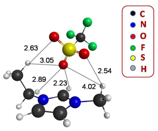 Lowest energy configuration of the EMI–TfO ionic couple, obtained by DFT calculations employing the ωB97X-D functional (including empirical dispersion corrections) and the 6-31G** basis set. The numbers are the distances of selected atoms, expressed in Å.