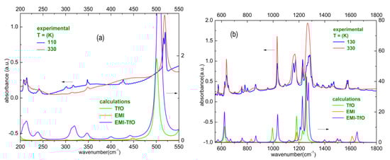 Comparison of the experimental absorbance spectra of EMI–TfO at 110 and 330 K (top part of the panels) with the calculations (bottom part of the panels). For the isolated TfO ion, a frequency scaling factor of 0.97 was used. The panel (a,b) reports the far- (mid-) infrared range.