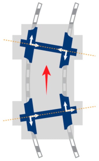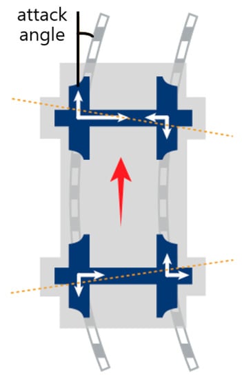 When the railway vehicle runs on the curved section, attack angle between the wheel and the rail are generated as shown in Figure 1 due to the lack of steering function of the wheel []. This causes unnecessary force in the driving direction and the lateral direction of the wheel, which is a major factor causing wear of the wheels and rails and the generation of noise.
