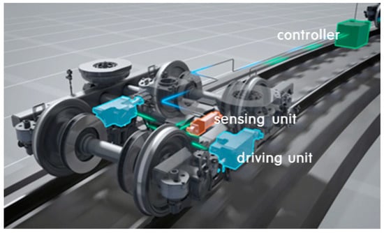 An active steering bogie adopts a radial steering position control strategy based on real-time curvature radius estimation [,,]. The active steering system of the bogie is composed of a sensor unit, a control unit and a driving unit [].