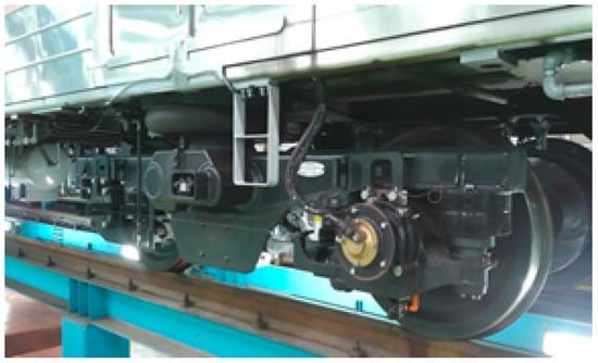 To analyze the steering performance according to the steering angle in the curve section, the test run was carried out using the active steering bogie prototype. An active steering bogie prototype was developed for subway EMU trains running on urban railway areas [,]. Figure 4 shows the configuration of the active steering bogie and Figure 5 shows the active steering bogie prototype installed on the test train.
