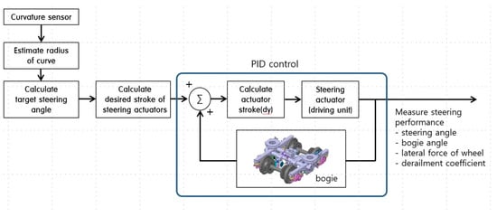 The steering controller is mounted on the body to perform steering control of the front and rear steering bogies. The control algorithm of the steering controller is shown in the block diagram in Figure 6. The controller for steering estimates the radius of curvature through the signal detected in real time from the curvature sensor and calculates the target steering angle. Figure 7 shows the mechanism by which the drive unit works to achieve the target steering angle. This control method has been experimentally verified through a test run using a test train equipped with an active steering bogie [].