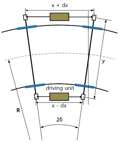 Figure 3 shows the geometrical relationship between the body and the bogies, assuming the vehicle is in the radial steering position in the curve section. In Figure 3, the angle (2δ) formed between two wheelsets is called the steering angle, and the angle (θ) at which the bogie is rotated with respect to the vehicle body is called the bogie angle.