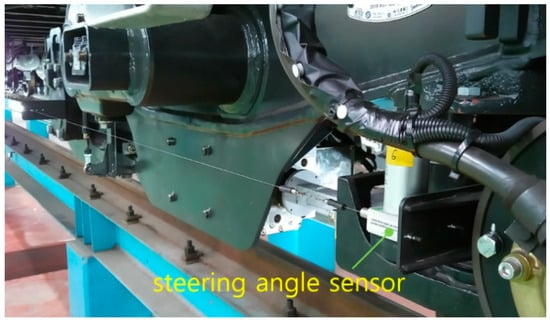 To confirm the test conditions for steering angle implementation, steering angle was measured using a steering angle sensor as shown in Figure 9. To measure the bogie angle, which is the rotating angle between the body and the bogie, the geometric displacement between the body and the bogie was measured and converted into the bogie angle.