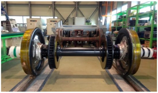 To measure the lateral force and the derailment coefficient of the wheel, a measuring wheelset was manufactured to measure the lateral and vertical force applied to the wheel and it was installed on the active steering bogie []. Figure 10 shows the measuring wheelset to measure wheel forces such as wheel lateral force and derailment coefficient. The method of measuring the action force applied to the wheels of a railway vehicle proposed by Ham was used [].
