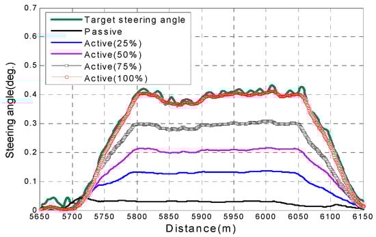 The steering angle of passive condition with insufficient steering function is 0.029 degrees. This indicates that the measured value is very low at 7.3% of the target value, considering that the target steering angle required to pass the R300 curve is 0.4 degrees according to Equation (1). As the steering angle implementation level increases with active steering control, the steering angle is approximated to the test conditions. That is, in the case of Active (50), it is 0.208 degrees., which is 52% of the target steering angle. In the case of Active (100) which performs 100% steering control, the measured value is 0.393 degrees., which is controlled well as 98.3% of the target steering angle.