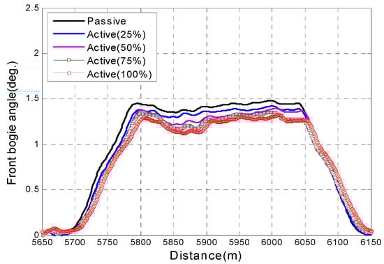 In the case of a passive state with insufficient steering function, the bogie angle for the front bogie is 1.404 degrees and that for the rear bogie is 1.055 degrees and the difference is 0.349 degrees, which is very large. This result is due to the lack of steering function and the bogie is not aligned in the radial steering position when running on the curved section.