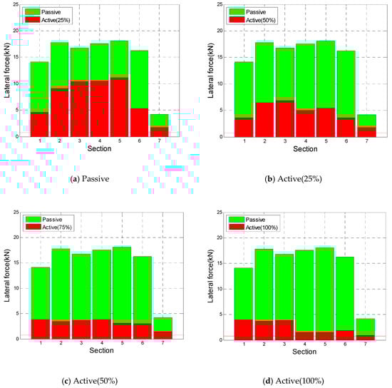 Figure 16 is the result of analyzing the lateral force test data by subdividing 70 m into small sections and arranging them in the cumulative distribution order to extract 99.85% of the values as the representative sections of the small sections. Table 5 shows the mean values of the small section representative values for the analysis results in Figure 15 and the reduction rate for the lateral force of each test case for the passive case.