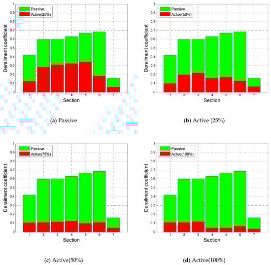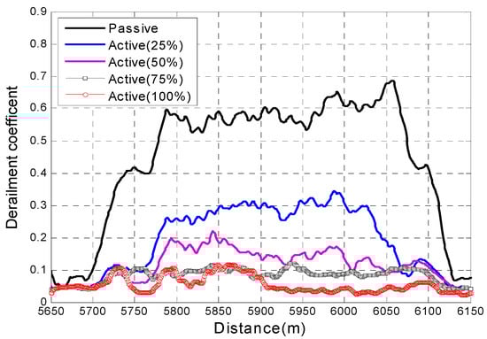 In the case of active (50) and active (75), the average derailment coefficients were 0.148 and 0.099, respectively, decreasing by 72.5% and 81.6%, respectively. In the case of Active (100) with 100% steering control, the mean derailment coefficient is 0.074, which is 86.3% lower than the passive case. This means that the derailment coefficient is naturally reduced if the wheel lateral force is reduced because the derailment coefficient is the ratio of the lateral force to the vertical force of the wheel. Accordingly, it can be seen that the wheel lateral force is reduced by the active steering control and the derailment coefficient, which is a vehicle running safety evaluation factor, is also significantly reduced.