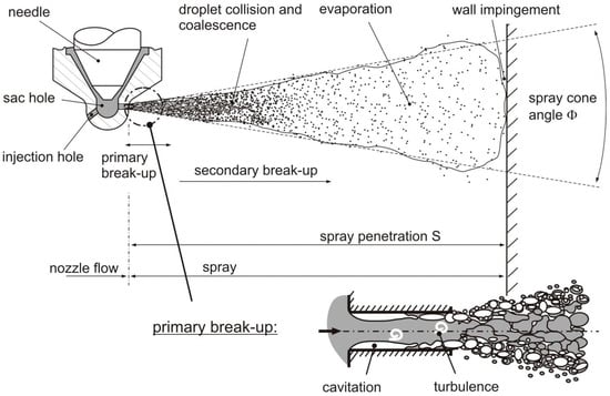 A schematic diagram of a spray development process is shown in Figure 1 [3]. The left side of the figure shows the cut model of an injector tip. The fuel flows through the small channel between the needle and the injector body. Then, the fuel is injected to the chamber through the sac and the nozzle orifice. The liquids are fragmented into huge droplets, ligaments and small droplets near the nozzle exit (primary breakup). These forms of liquids are further fragmented to a large amount of small droplets (secondary breakup). These small droplets are dispersed by the entrained air.